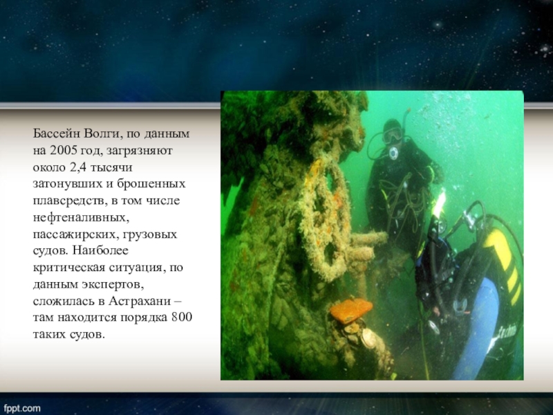 затонувших и брошенных плавсредств, в том числе нефтеналивных, пассажирских, грузовых судов. Наиболее критическая ситуация, по данным экспертов, сложилась в Астрахани – там находится порядка 800 таких судов.