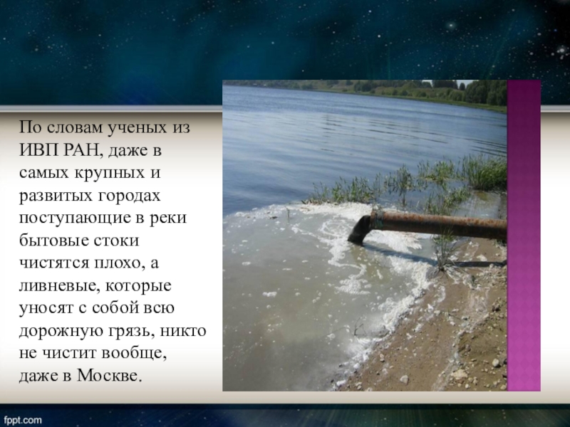 развитых городах поступающие в реки бытовые стоки чистятся плохо, а ливневые, которые уносят с собой всю дорожную грязь, никто не чистит вообще, даже в Москве.