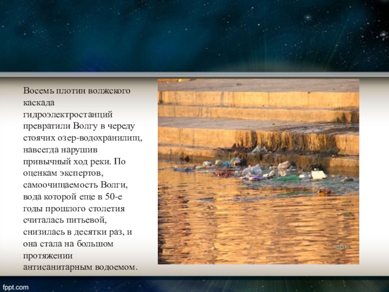 навсегда нарушив привычный ход реки. По оценкам экспертов, самоочищаемость Волги, вода которой еще в 50-е годы прошлого столетия считалась питьевой, снизилась в десятки раз, и она стала на большом протяжении антисанитарным водоемом.