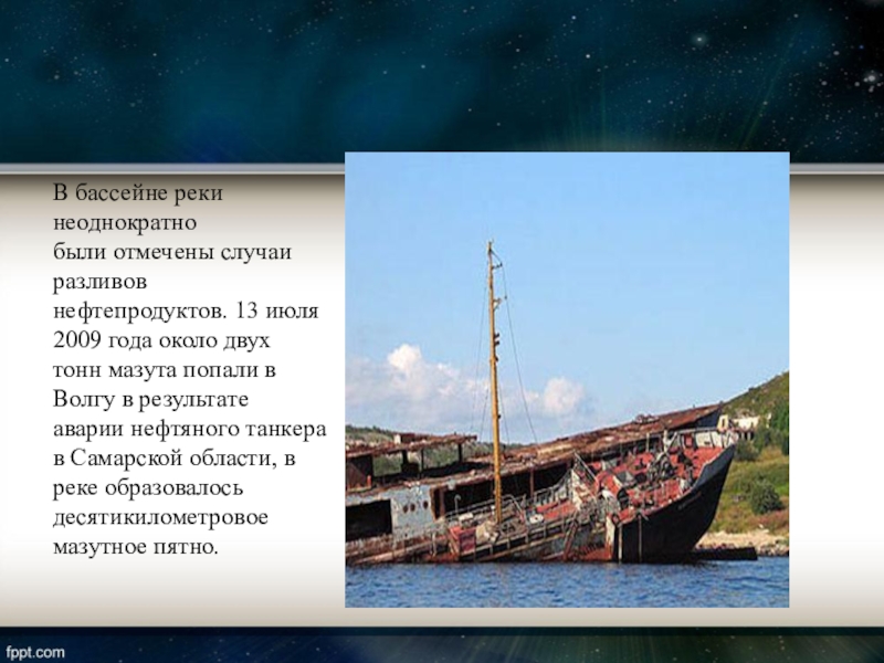 года около двух тонн мазута попали в Волгу в результате аварии нефтяного танкера в Самарской области, в реке образовалось десятикилометровое мазутное пятно.