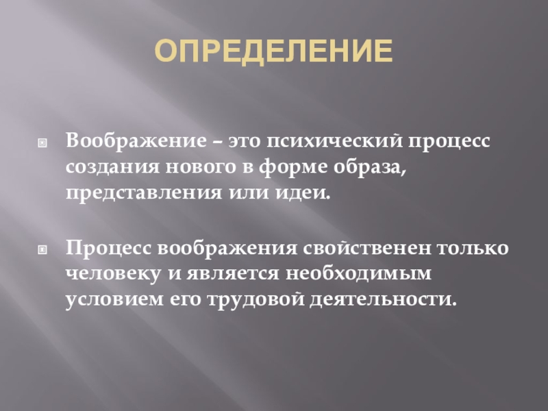 ОПРЕДЕЛЕНИЕВоображение – это психический процесс создания нового в форме образа, представления или идеи. Процесс воображения свойственен только человеку и является необходимым условием его трудовой деятельности.