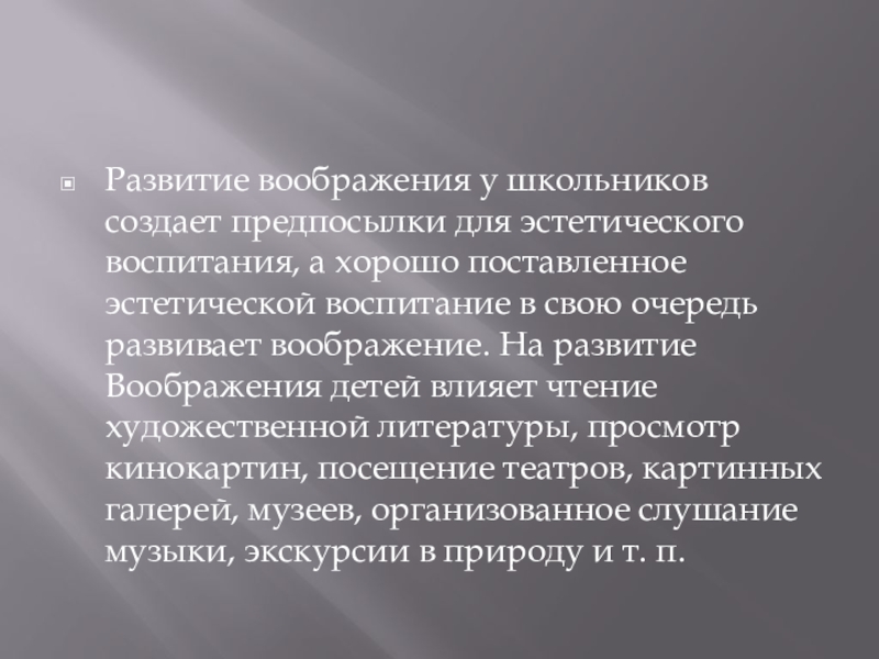Развитие воображения у школьников создает предпосылки для эстетического воспитания, а хорошо поставленное эстетической воспитание в свою очередь