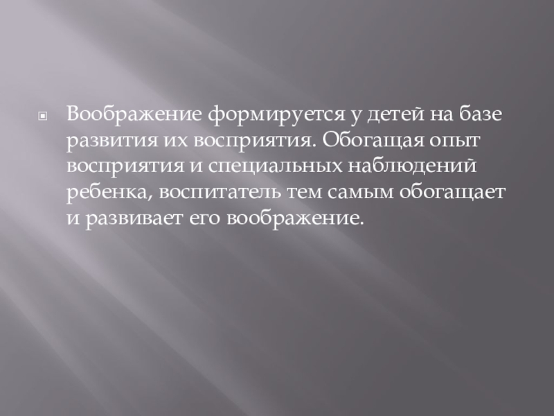 Слайд 3Воображение формируется у детей на базе развития их восприятия. Обогащая опыт