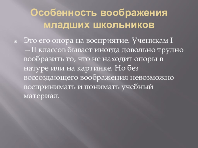 Особенность воображения младших школьниковЭто его опора на восприятие. Ученикам I —II классов бывает иногда довольно трудно вообразить