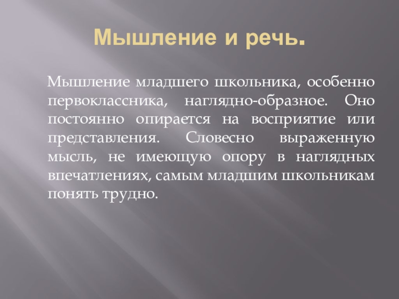 Мышление и речь.  Мышление младшего школьника, особенно первоклассника, наглядно-образное. Оно постоянно опирается на восприятие или представления.