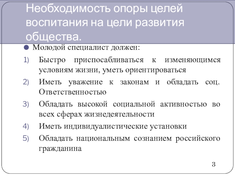 Необходимость опоры целей воспитания на цели развития общества.Молодой специалист должен:Быстро приспосабливаться к изменяющимся условиям жизни, уметь ориентироватьсяИметь