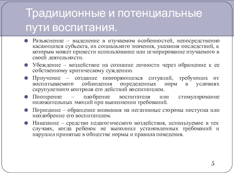 Традиционные и потенциальные пути воспитания.Разъяснение – выделение в изучаемом особенностей, непосредственно касающихся субъекта, их социального значения, указания