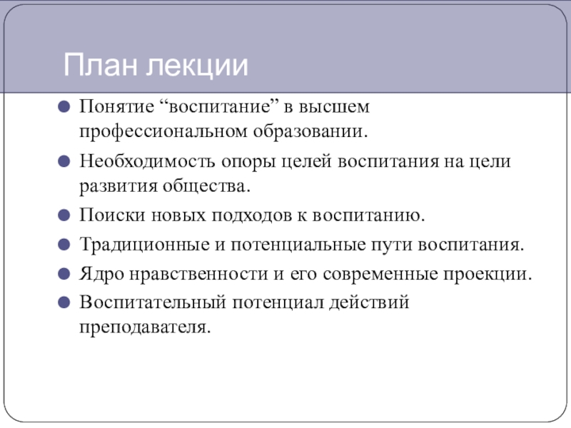 План лекцииПонятие “воспитание” в высшем профессиональном образовании.Необходимость опоры целей воспитания на цели развития общества.Поиски новых подходов к воспитанию.Традиционные и потенциальные пути воспитания.Ядро нравственности и его современные проекции.Воспитательный потенциал действий преподавателя.