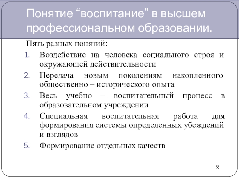 Понятие “воспитание” в высшем профессиональном образовании.Пять разных понятий:Воздействие на человека социального строя и окружающей действительностиПередача новым поколениям