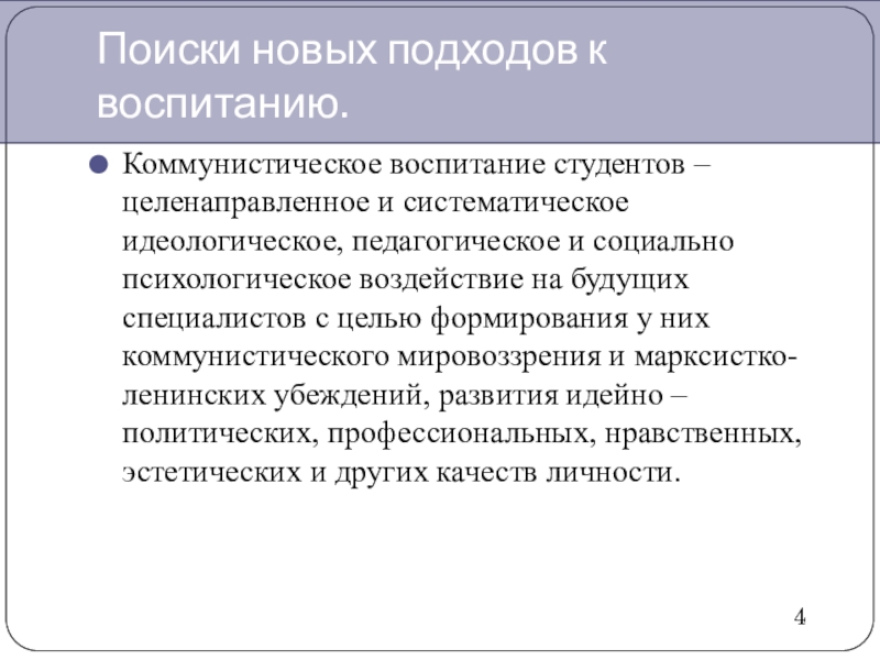 Поиски новых подходов к воспитанию.Коммунистическое воспитание студентов – целенаправленное и систематическое идеологическое, педагогическое и социально психологическое воздействие