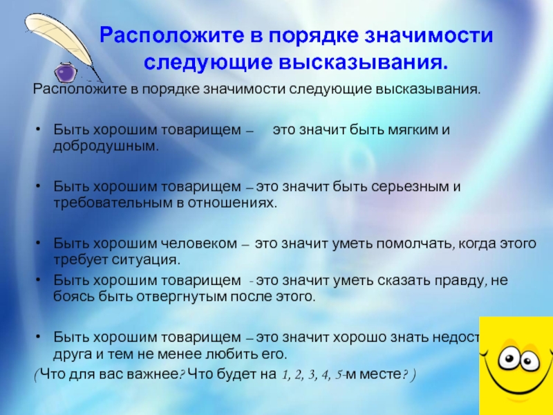 Слайд 17Расположите в порядке значимости следующие высказывания.