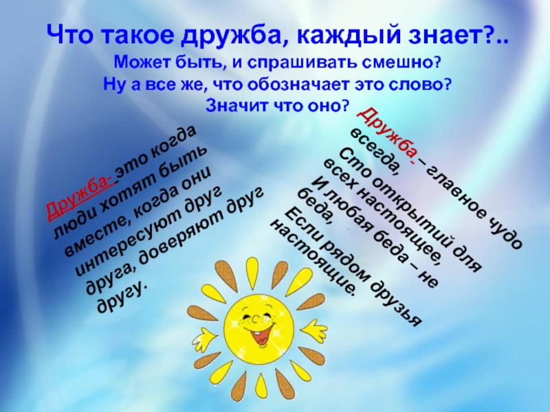 Дружба- это когда люди хотят быть вместе, когда они интересуют друг друга, доверяют друг другу.