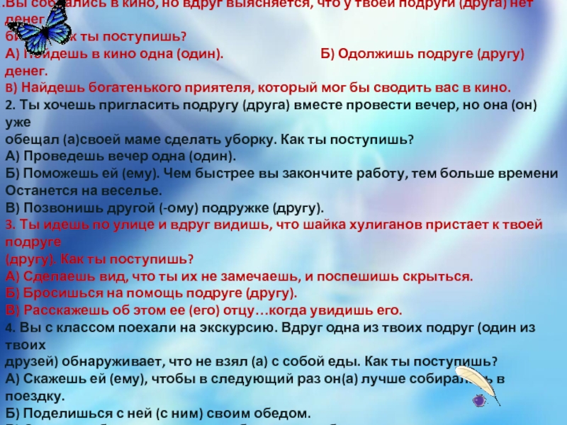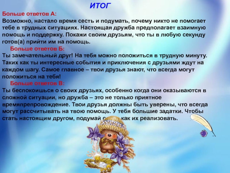 Ты замечательный друг! На тебя можно положиться в трудную минуту. Таких как ты интересные события и приключения с друзьями ждут на каждом шагу. Самое главное – твои друзья знают, что всегда могут положиться на тебя!