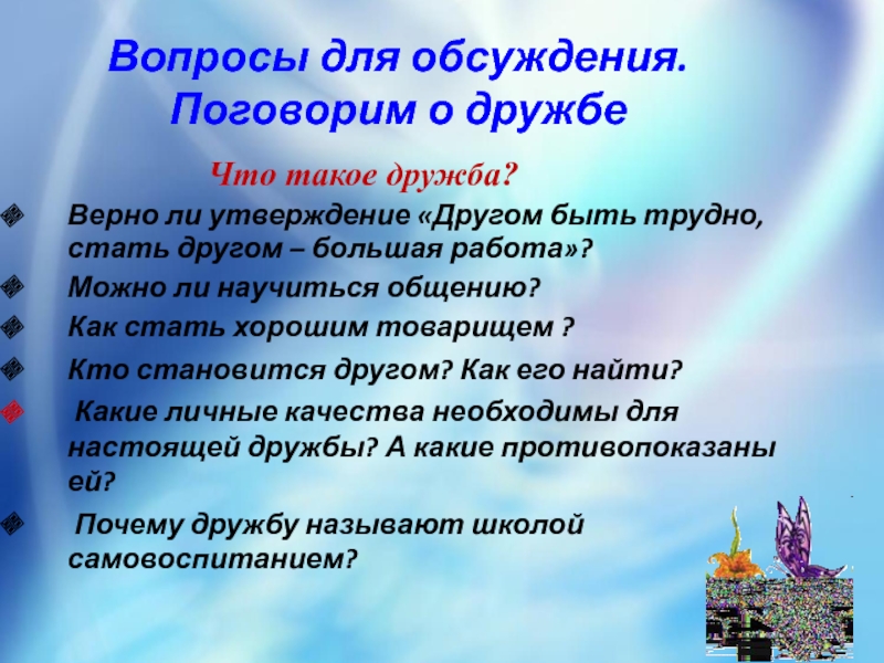 Слайд 3Вопросы для обсуждения. Поговорим о дружбе