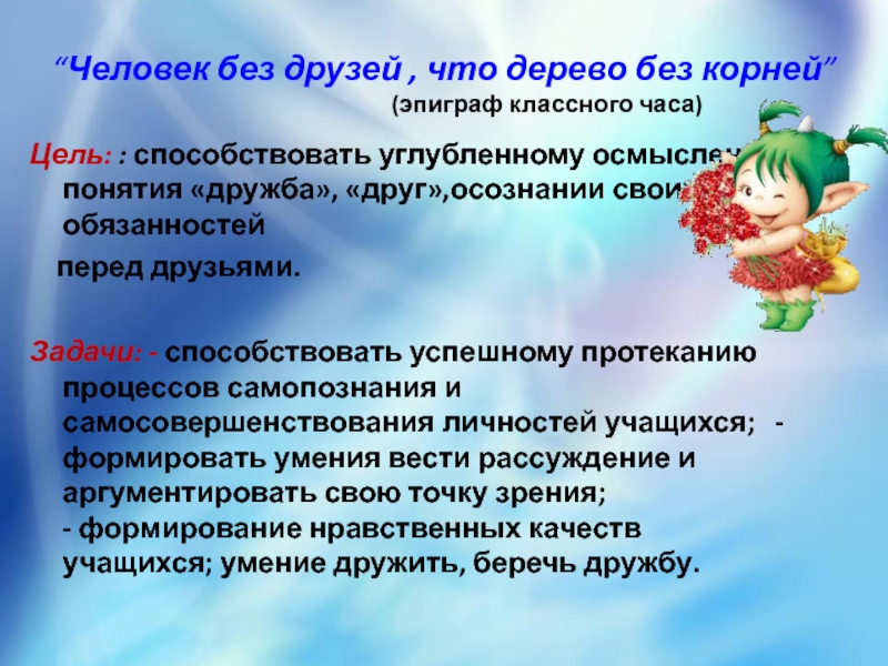 Задачи: - способствовать успешному протеканию процессов самопознания и самосовершенствования личностей учащихся; - формировать умения вести рассуждение и аргументировать свою точку зрения; - формирование нравственных качеств учащихся; умение дружить, беречь дружбу.
