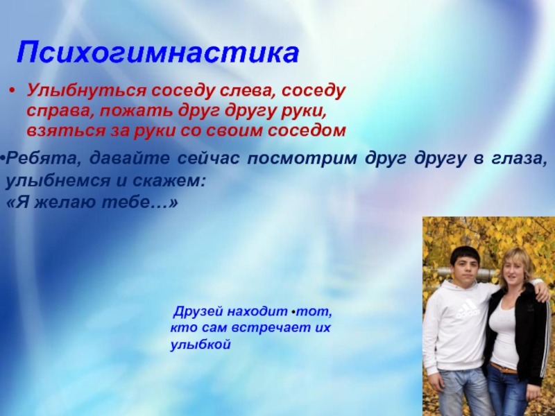 Улыбнуться соседу слева, соседу справа, пожать друг другу руки, взяться за