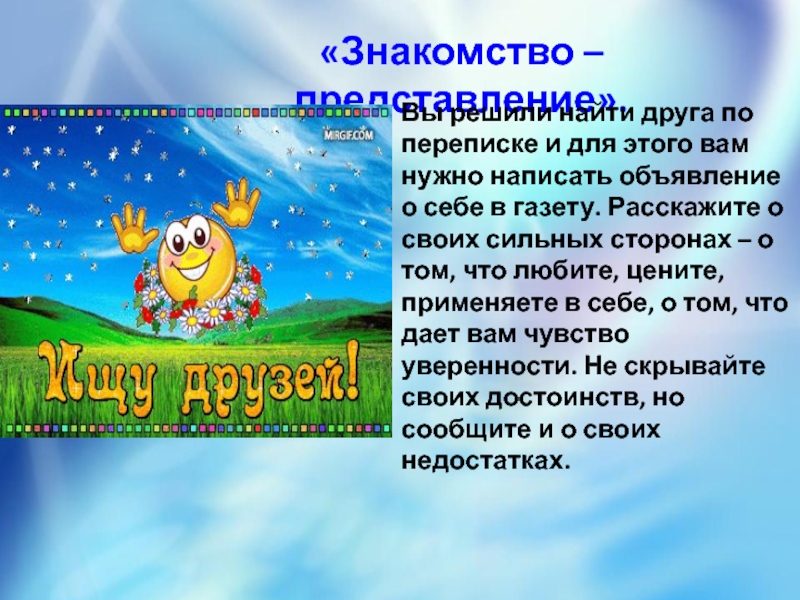 вам нужно написать объявление о себе в газету. Расскажите о своих сильных сторонах – о том, что любите, цените, применяете в себе, о том, что дает вам чувство уверенности. Не скрывайте своих достоинств, но сообщите и о своих недостатках.
