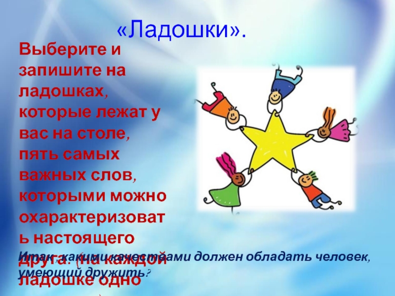 вас на столе, пять самых важных слов, которыми можно охарактеризовать настоящего друга. (на каждой ладошке одно качество).