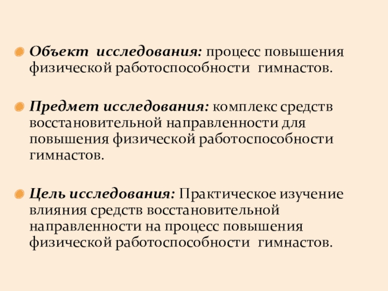 Слайд 4Объект исследования: процесс повышения физической работоспособности гимнастов.