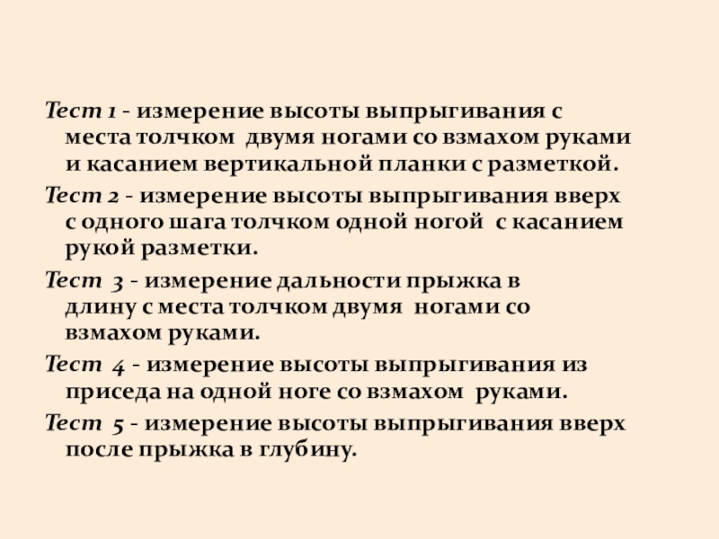 Слайд 10Тест 1 - измерение высоты выпрыгивания с места толчком двумя ногами со взмахом руками и касанием