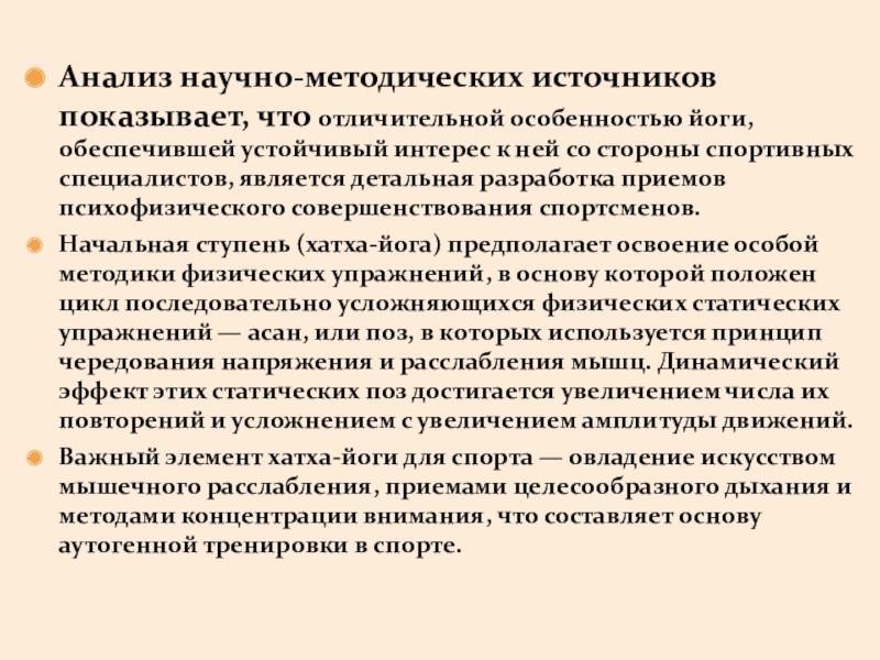 Слайд 7Анализ научно-методических источников показывает, что отличительной особенностью йоги, обеспечившей устойчивый интерес