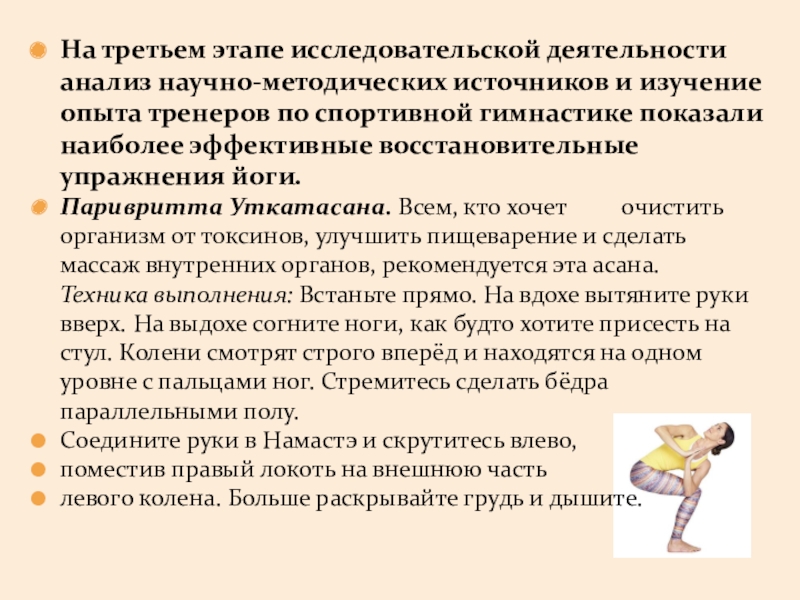 Паривритта Уткатасана. Всем, кто хочет очистить организм от токсинов, улучшить пищеварение и сделать массаж внутренних органов, рекомендуется эта асана.