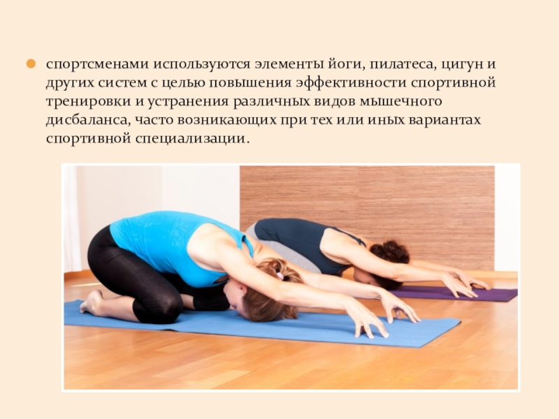 Слайд 15спортсменами используются элементы йоги, пилатеса, цигун и других систем с целью