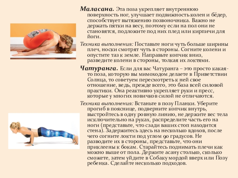 Слайд 13Маласана. Эта поза укрепляет внутреннюю поверхность ног, улучшает подвижность колен и бёдер,