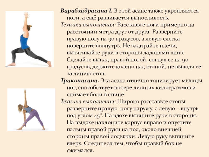 Слайд 12Вирабхадрасана I. В этой асане также укрепляются ноги, а ещё развивается выносливость.