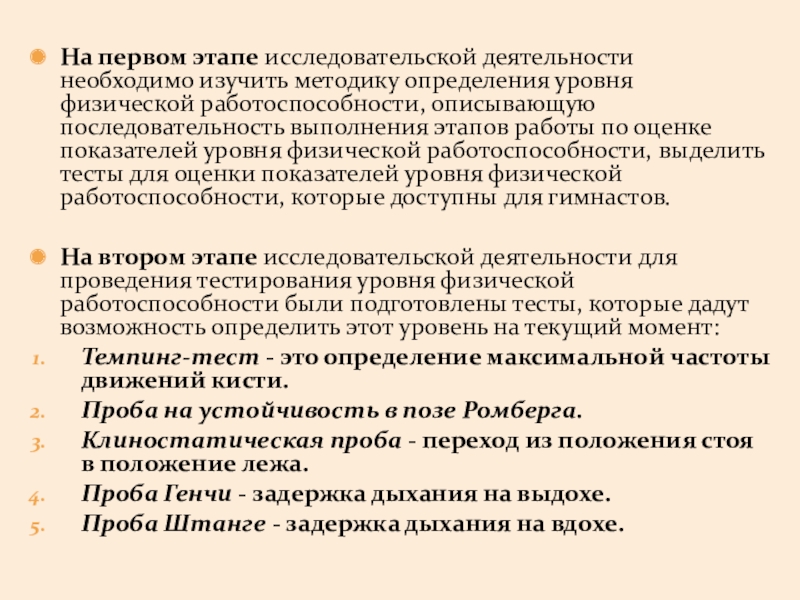 работоспособности, описывающую последовательность выполнения этапов работы по оценке показателей уровня физической работоспособности, выделить тесты для оценки показателей уровня физической работоспособности, которые доступны для гимнастов.