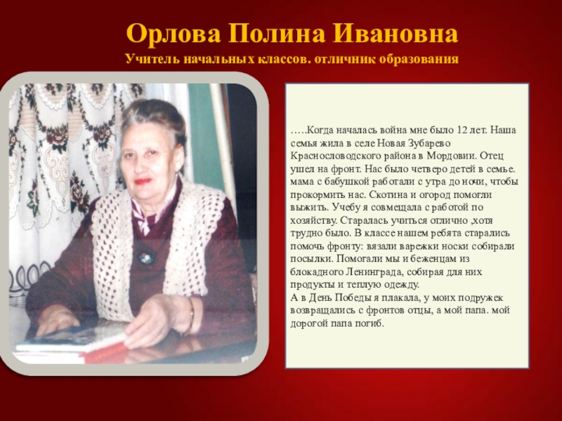 селе Новая Зубарево Краснословодского района в Мордовии. Отец ушел на фронт. Нас было четверо детей в семье. мама с бабушкой работали с утра до ночи, чтобы прокормить нас. Скотина и огород помогли выжить. Учебу я совмещала с работой по хозяйству. Старалась учиться отлично ,хотя трудно было. В классе нашем ребята старались помочь фронту: вязали варежки носки собирали посылки. Помогали мы и беженцам из блокадного Ленинграда, собирая для них продукты и теплую одежду.