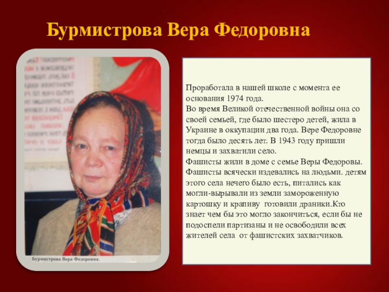 Великой отечественной войны она со своей семьей, где было шестеро детей, жила в Украине в оккупации два года. Вере Федоровне тогда было десять лет. В 1943 году пришли немцы и захватили село.