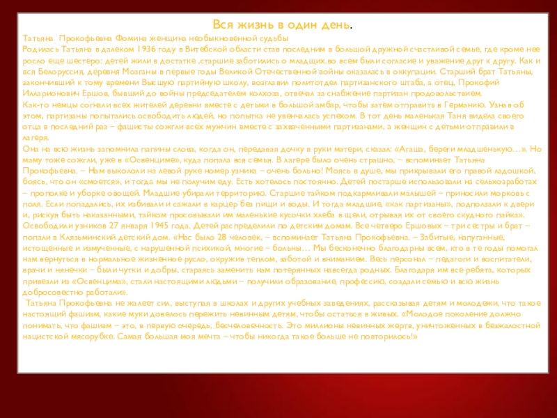 Как-то немцы согнали всех жителей деревни вместе с детьми в большой амбар, чтобы затем отправить в Германию. Узнав об этом, партизаны попытались освободить людей, но попытка не увенчалась успехом. В тот день маленькая Таня видела своего отца в последний раз – фашисты сожгли всех мужчин вместе с захваченными партизанами, а женщин с детьми отправили в лагеря.