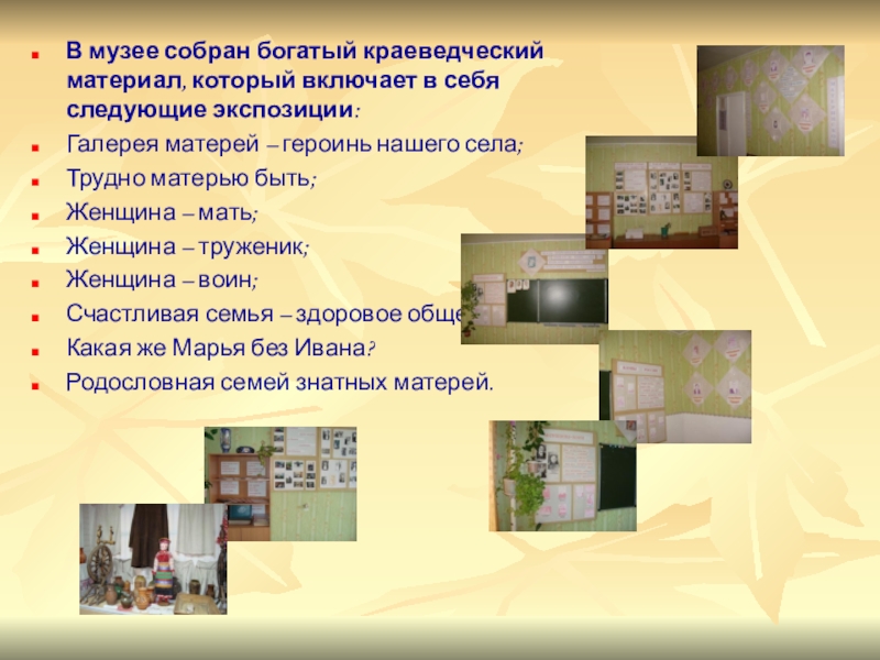 Слайд 5В музее собран богатый краеведческий материал, который включает в себя следующие
