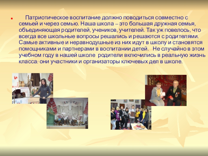 семьей и через семью. Наша школа – это большая дружная семья, объединяющая родителей, учеников, учителей. Так уж повелось, что всегда все школьные вопросы решались и решаются с родителями. Самые активные и неравнодушные из них идут в школу и становятся помощниками и партнерами в воспитании детей. Не случайно в этом учебном году в нашей школе родители включились в реальную жизнь класса: они участники и организаторы ключевых дел в школе.