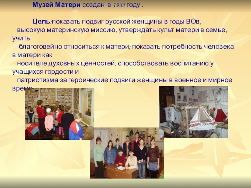 высокую материнскую миссию, утверждать культ матери в семье, учить