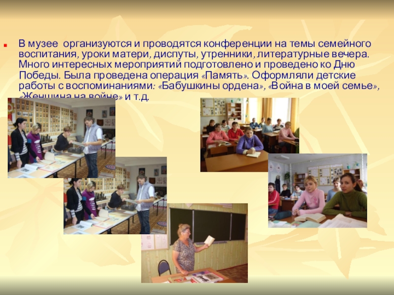 матери, диспуты, утренники, литературные вечера. Много интересных мероприятий подготовлено и проведено ко Дню Победы. Была проведена операция «Память». Оформляли детские работы с воспоминаниями: «Бабушкины ордена», «Война в моей семье», «Женщина на войне» и т.д.