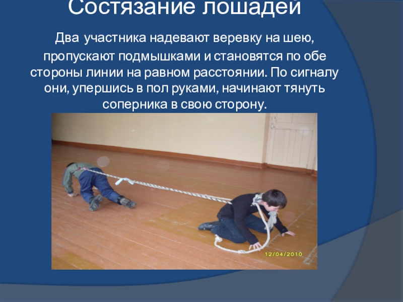 Слайд 17 Состязание лошадей Два участника надевают веревку на шею, пропускают подмышками и становятся