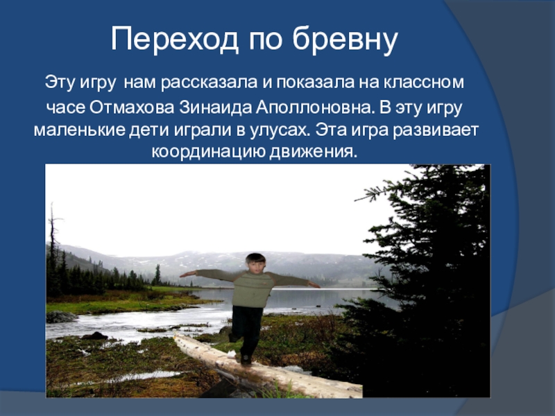 Слайд 6 Переход по бревну Эту игру нам рассказала и показала на классном часе