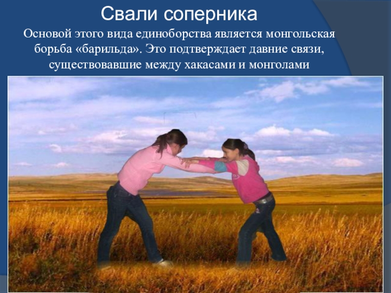 Слайд 5Свали соперника Основой этого вида единоборства является монгольская борьба «барильда».
