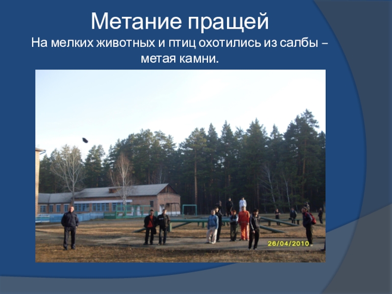 Слайд 7Метание пращей На мелких животных и птиц охотились из салбы –метая камни.