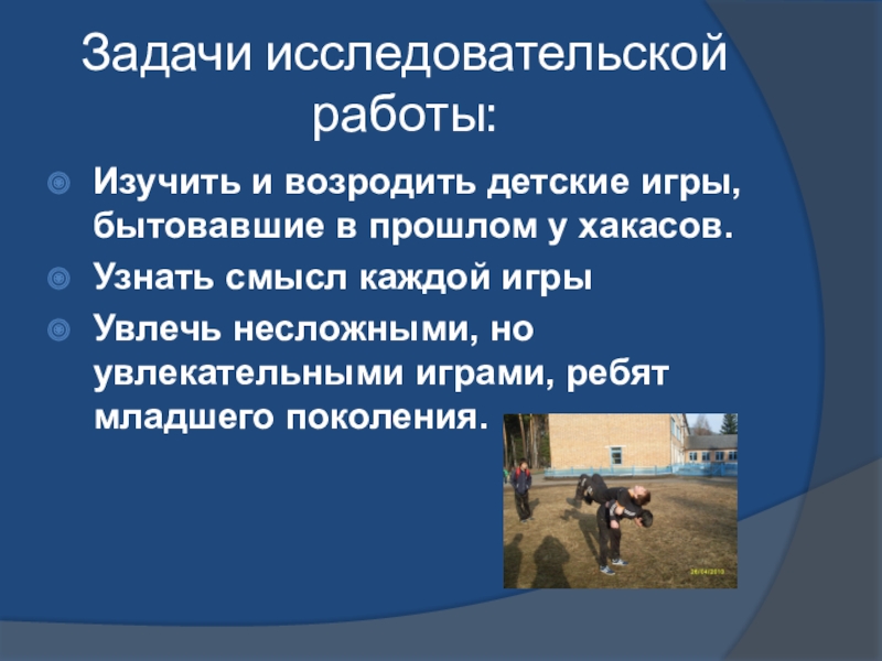 Задачи исследовательской работы:Изучить и возродить детские игры, бытовавшие в прошлом у хакасов. Узнать смысл каждой игрыУвлечь несложными,