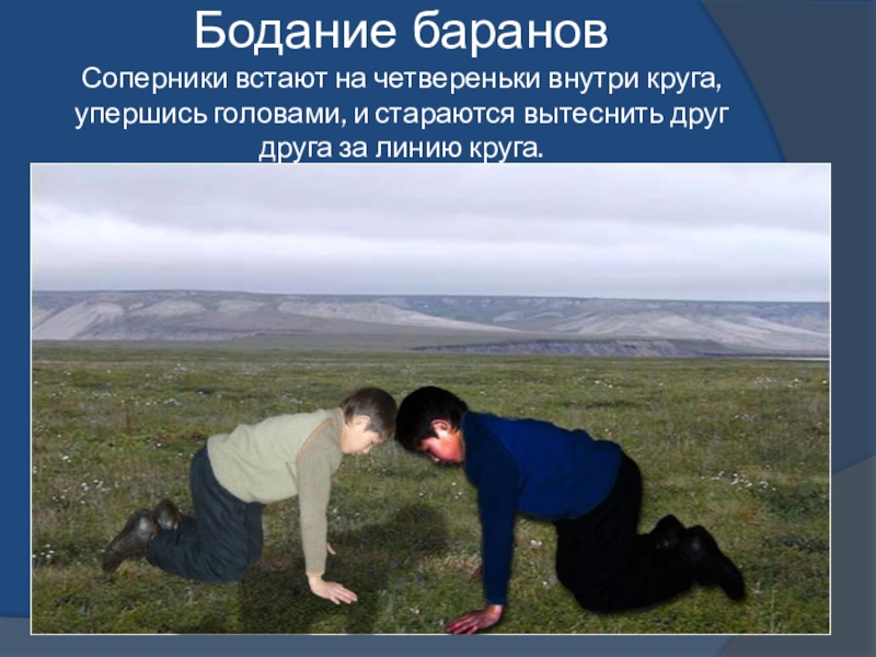 Слайд 10Бодание баранов Соперники встают на четвереньки внутри круга, упершись головами, и стараются