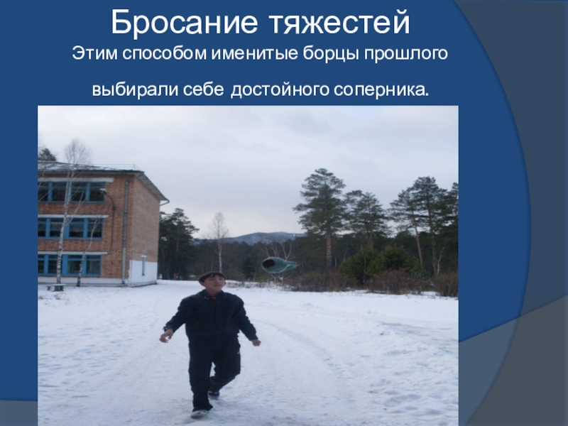 Слайд 12Бросание тяжестей Этим способом именитые борцы прошлого выбирали себе достойного соперника.