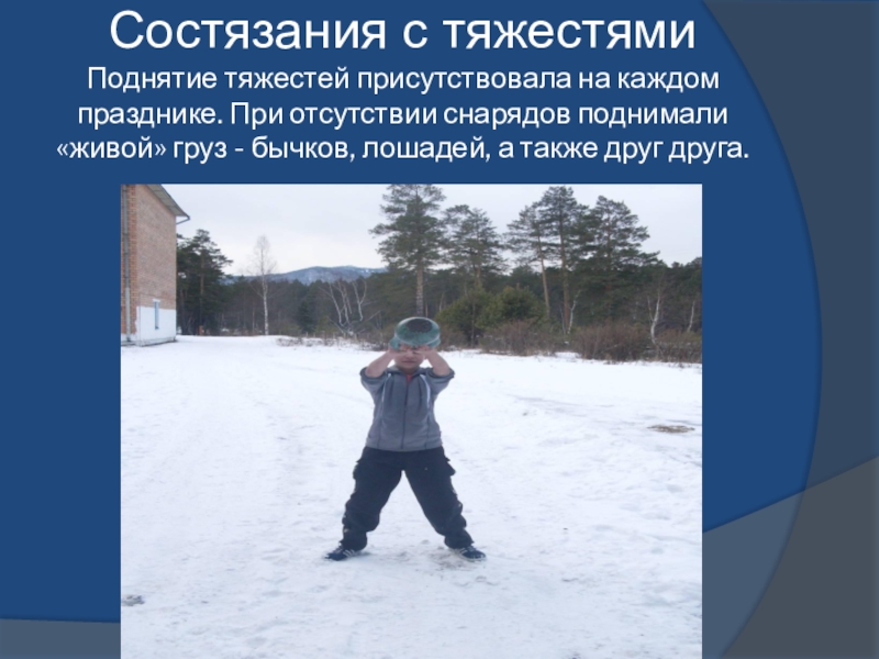 Слайд 11Состязания с тяжестями Поднятие тяжестей присутствовала на каждом празднике. При отсутствии снарядов