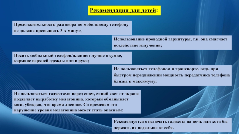 Использование проводной гарнитуры, т.к. она смягчает воздействие излучения;