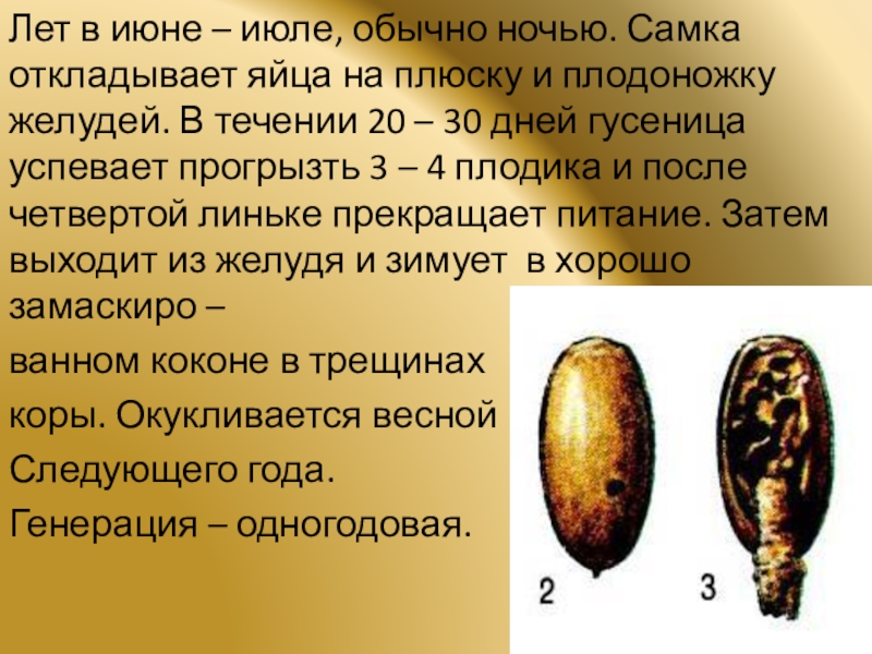 плюску и плодоножку желудей. В течении 20 – 30 дней гусеница успевает прогрызть 3 – 4 плодика и после четвертой линьке прекращает питание. Затем выходит из желудя и зимует в хорошо замаскиро –
