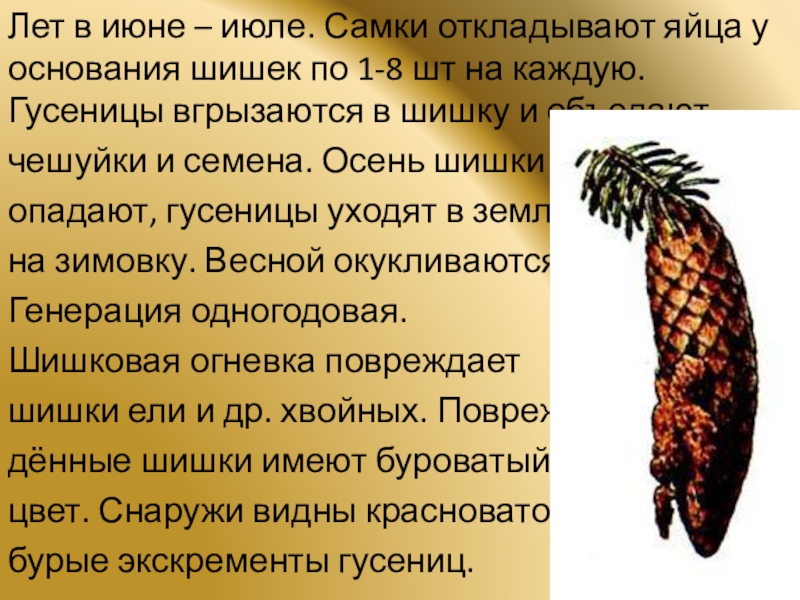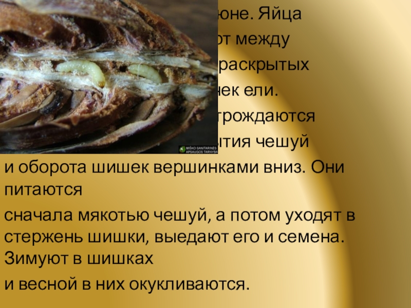 Слайд 9Лет в июне – июле. Самки откладывают яйца у основания шишек