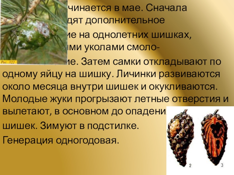 течение. Затем самки откладывают по одному яйцу на шишку. Личинки развиваются около месяца внутри шишек и окукливаются. Молодые жуки прогрызают летные отверстия и вылетают, в основном до опадения