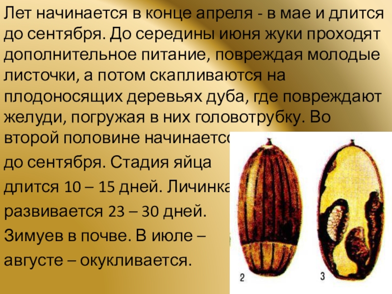 сентября. До середины июня жуки проходят дополнительное питание, повреждая молодые листочки, а потом скапливаются на плодоносящих деревьях дуба, где повреждают желуди, погружая в них головотрубку. Во второй половине начинаетсся кладка и длится